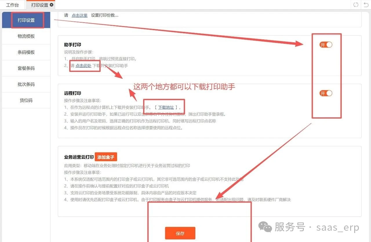 鼠标放置到设置---点击打印设置---在打印设置页面开启助手打印及远程打印后保持即可;
