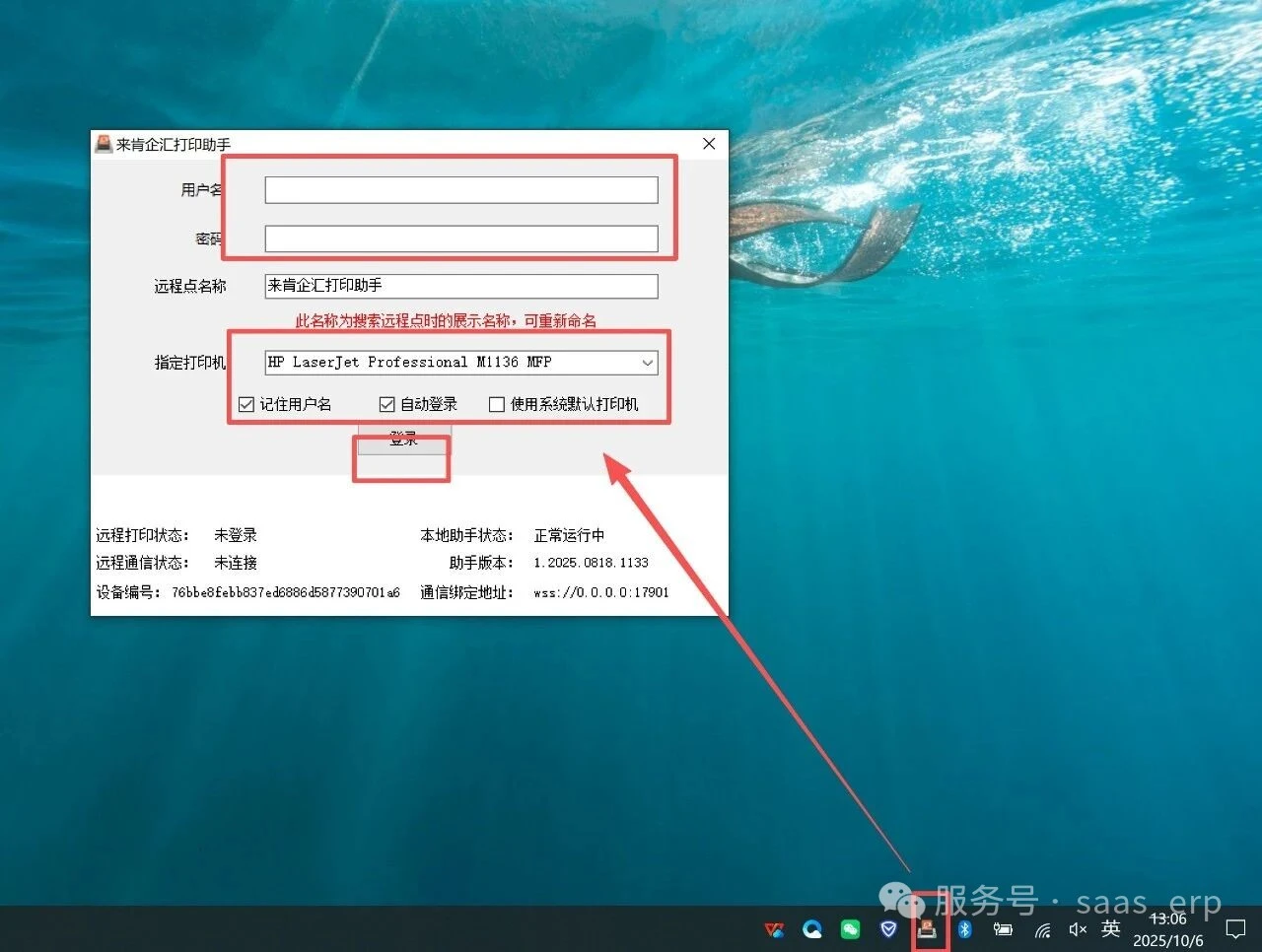 在电脑桌面找到下载的安装文件后双击运行安装,安装时一定要勾选创建桌面快捷方式和开机自动启动,安装完成后到电脑右下加的任务栏找到双击后打开登录页面(如果提示重复运行肯定时任务栏已经启动了打印助手,双击即可打开),在登录界面输入用户名和密码(打印助手的用户名密码就是软件的登录用户名和密码)---指定打印机选择已经链接到电脑的打印机的驱动名称---勾选记住用户名和自动登录后点击登录---登录后打印助手或缩回到任务栏,双击打开检查一下打印状态、通信状态和本地助手状态是否正常,检查正藏后右上角叉掉打印助手后自动缩回到任务栏即可。