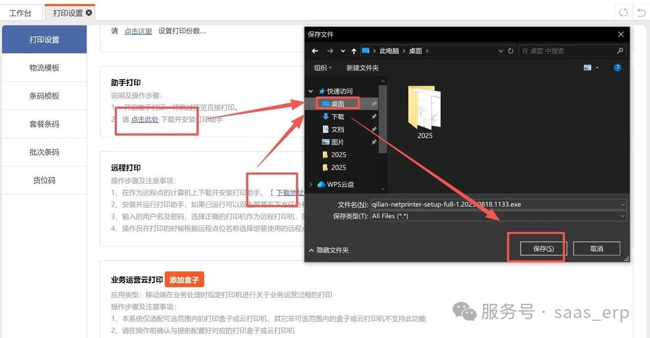 鼠标放置到设置---点击打印设置---在打印设置页面开启助手打印及远程打印后保持即可;
