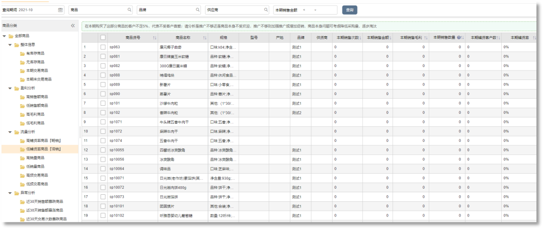 在“流量商品分析”中的“低铺货率商品”、“低销量商品”、“低频交易商品”,这三张数据统计分析表代表的就是企业仓库内的滞销品,商贸企业可以考虑将其与高销量和高铺货率、高频交易商品进行组合营销,或增加促销活动的频次,促进这部分产品的销售,如果是产品本身存在问题则需要考虑降低其采购量,然后逐步淘汰。