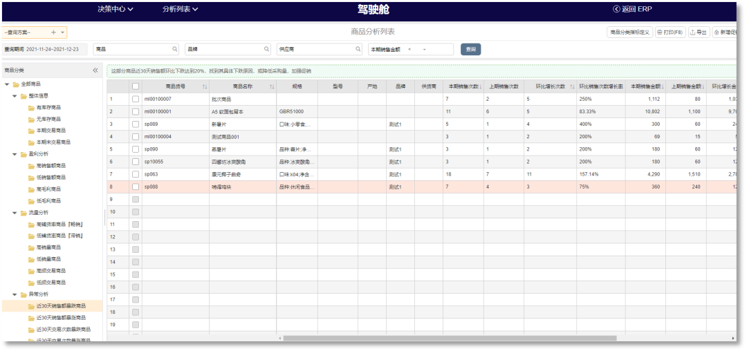 在报表查询统计模块,可以查到每个月的销售情况,将销售排名靠后3—5位的产品进行淘汰,或者要求供应商协作与公司针对不动销品类提出对应的解决方案,例如可以制定会员积分返利模式以及卖场促销活动,最终目标都是要拉动销量,提升库存的周转频次。