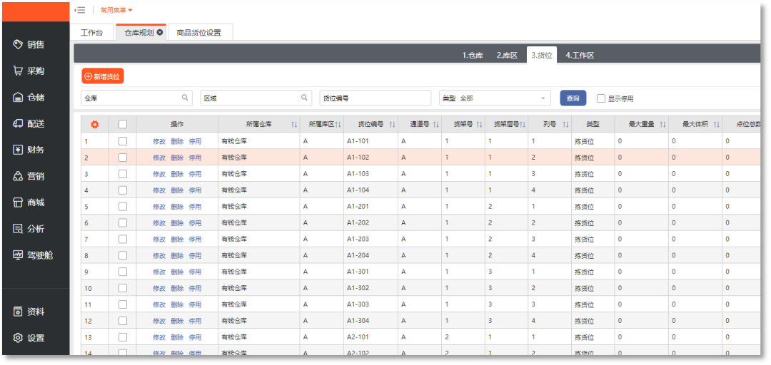 我们云进销存ERP仓库管理系统,其中就包含了库房分区规划,提供了库存、通道、工作区、商品货位的规划方案,帮助商贸企业最大程度地利用仓储面积,提升仓储利用率,实现坪效最大化。